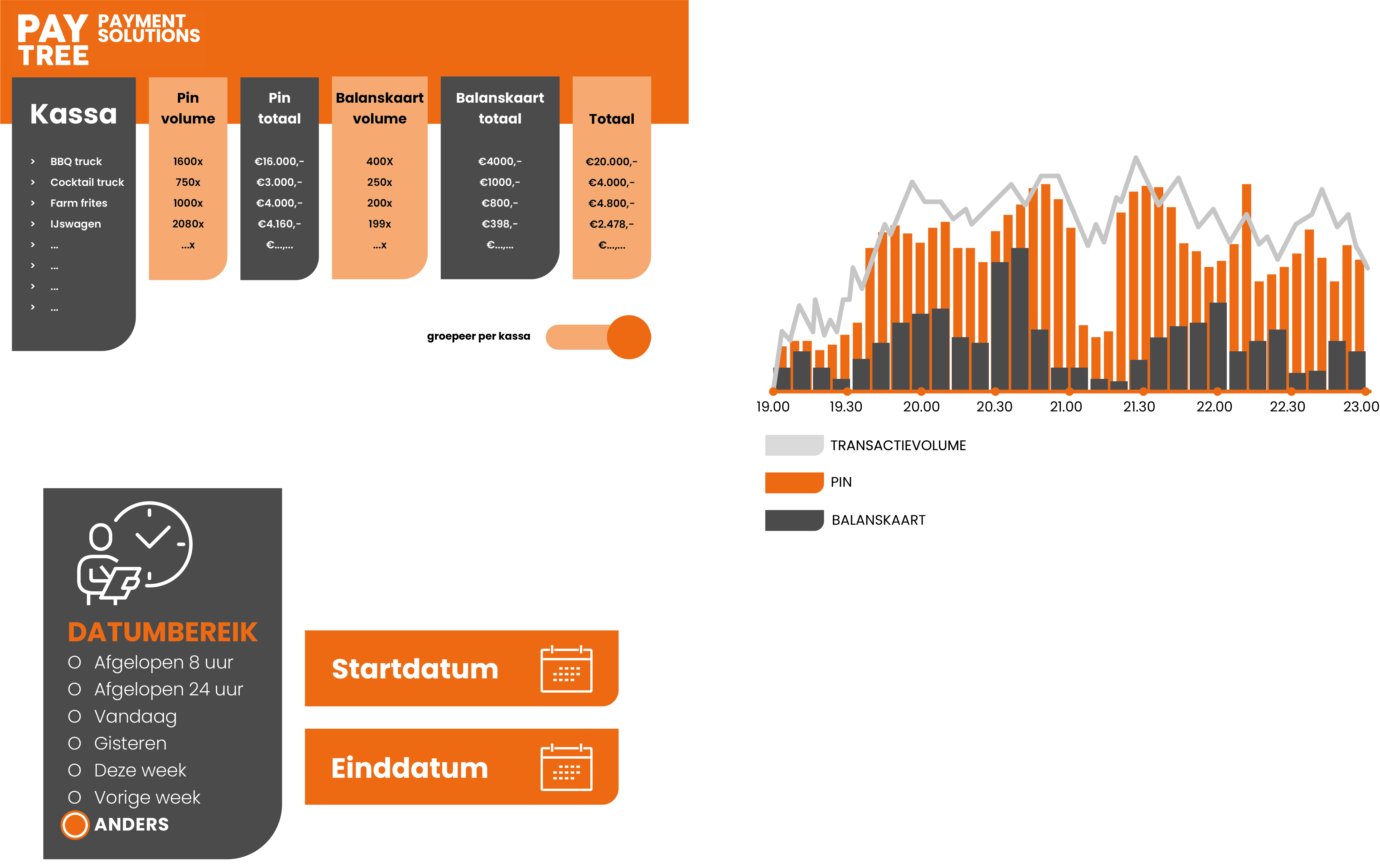 Als evenementorganisator wil je altijd grip hebben op de belangrijkste aspecten van je evenement: van transacties en voorraadbeheer tot de prestaties van je personeel. Met het real- time dashboard van Paytree krijg je direct inzicht in alle belangrijke gegevens, zodat je sneller beslissingen kunt nemen en jouw evenement strategisch kunt beheren.